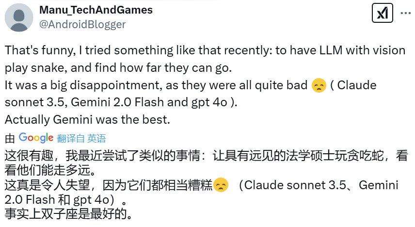 值得一提的是,LLM对抗竞技易复现,CoreView联合创始人让deepseek-r1:32b与qwen2.5-coder:32b进行贪吃蛇比赛,也有用户分享让有视觉能力的LLM玩贪吃蛇的经历,结果与SnakeBench不同,gemini表现最佳。