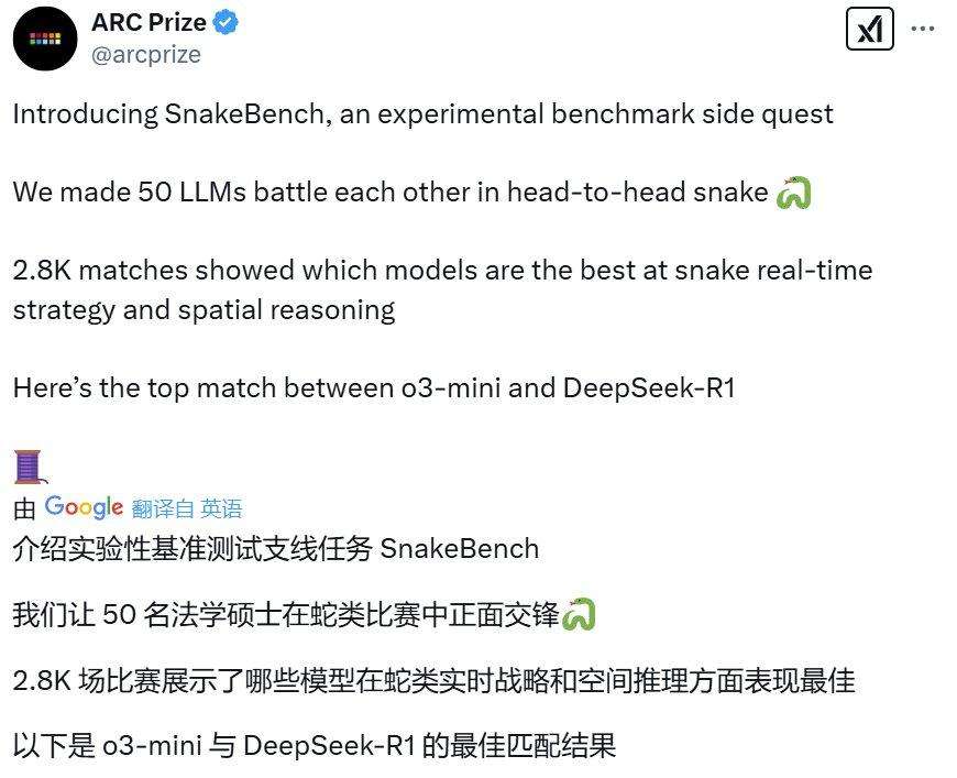 ARC Prize发布报告显示,DeepSeek-R1在ARC-AGI-1上表现逊于OpenAI的o1系列模型,更不及o3系列,不过其具备成本低的独特优势。上周六,ARCPrize推出新的1v1对抗性基准SnakeBench,DeepSeek-R1在此超越o1-mini,与o3-mini差距微小。