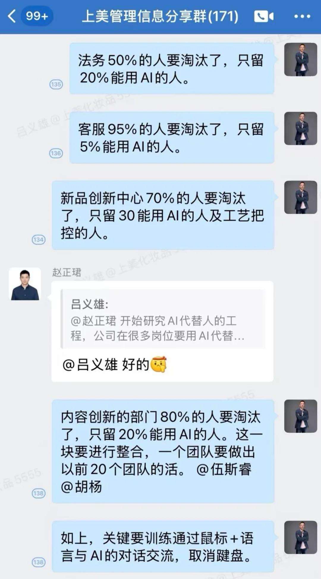 企业裁员风波,AI成为关注焦点网上流传上美公司董事长下达裁员指示,称只留能用AI的人,部门最高裁员比例达95%。不过吕义雄回应公司并非裁员,今年总体人数会增加,只是人员结构调整,强调要学会用AI提高效率。这反映出AI在企业中愈发受重视,掌握AI工具使用成为打工人必备技能,科技发展是为撬动更大生产力,未来大众将从焦虑AI转变为主动学习。
