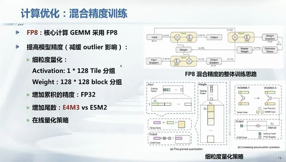 计算优化采用混合精度训练策略,引入英伟达FP8混合精度训练框架,在超大规模模型上验证其有效性,实现加速训练和减少GPU内存使用。