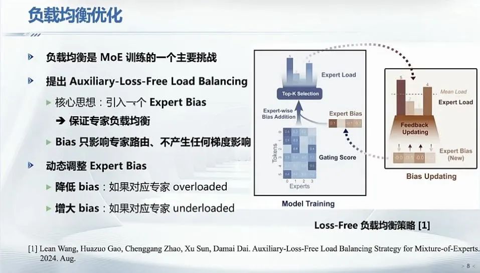 负载均衡优化上,提出“Auxiliary-loss-free(无辅助损失)”方案,不依赖额外辅助损失,通过在token专家分配中施加bias实现负载均衡,避免传统方案因辅助损失权重设置不当带来的训练不稳定问题,如同动态调整时长的红绿灯优化资源分配。