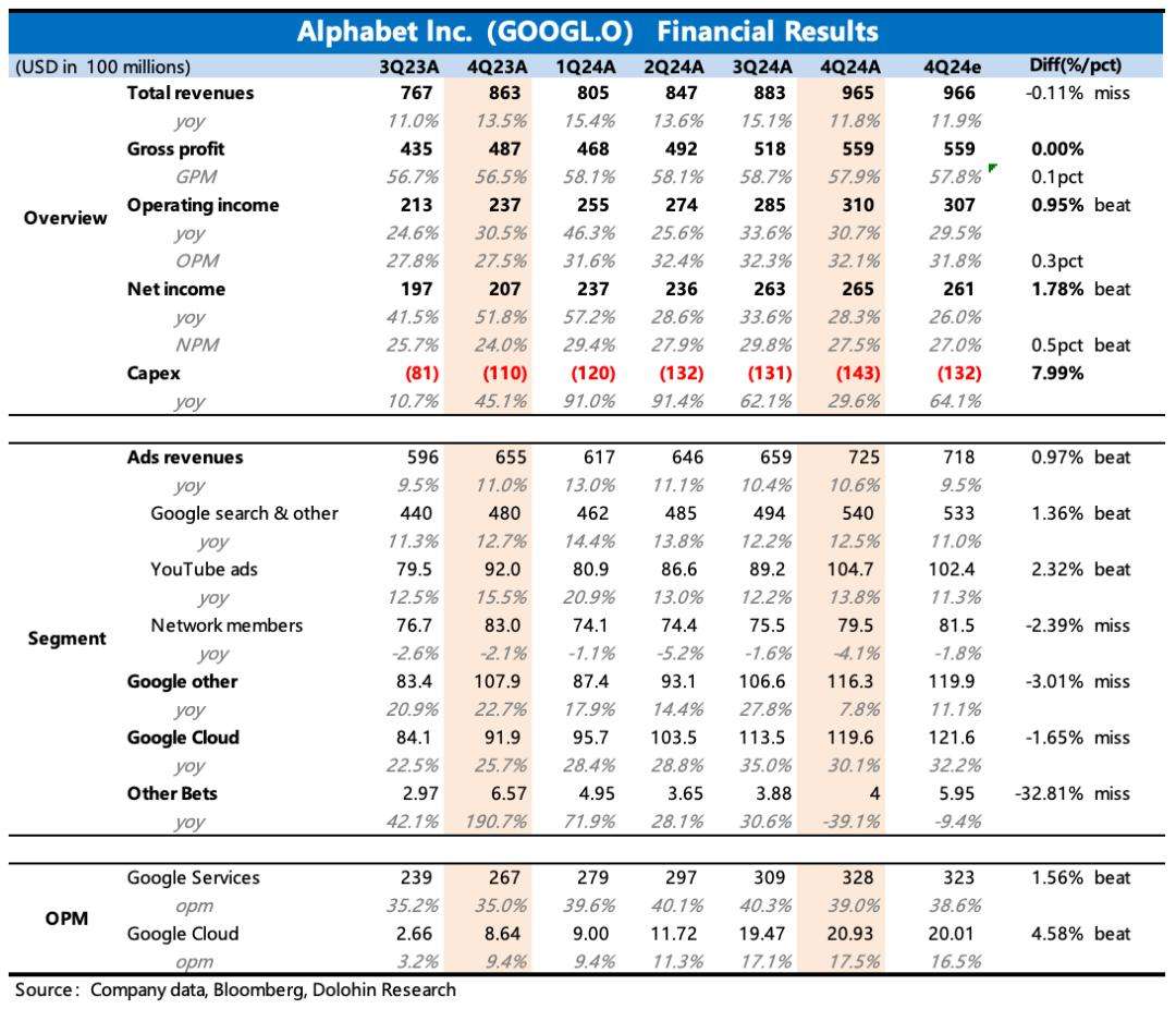 其他收入表现不及预期,主要因Pixel硬件销售周期波动。四季度其他收入增速回落到8%,是由于将包含gemini Nano的Pixel9系列手机提前到三季度发售,导致同比增速波动。不过硬件之外的软件服务收入,如YouTube TV、Music Premium以及GoogleOne则正常增长。