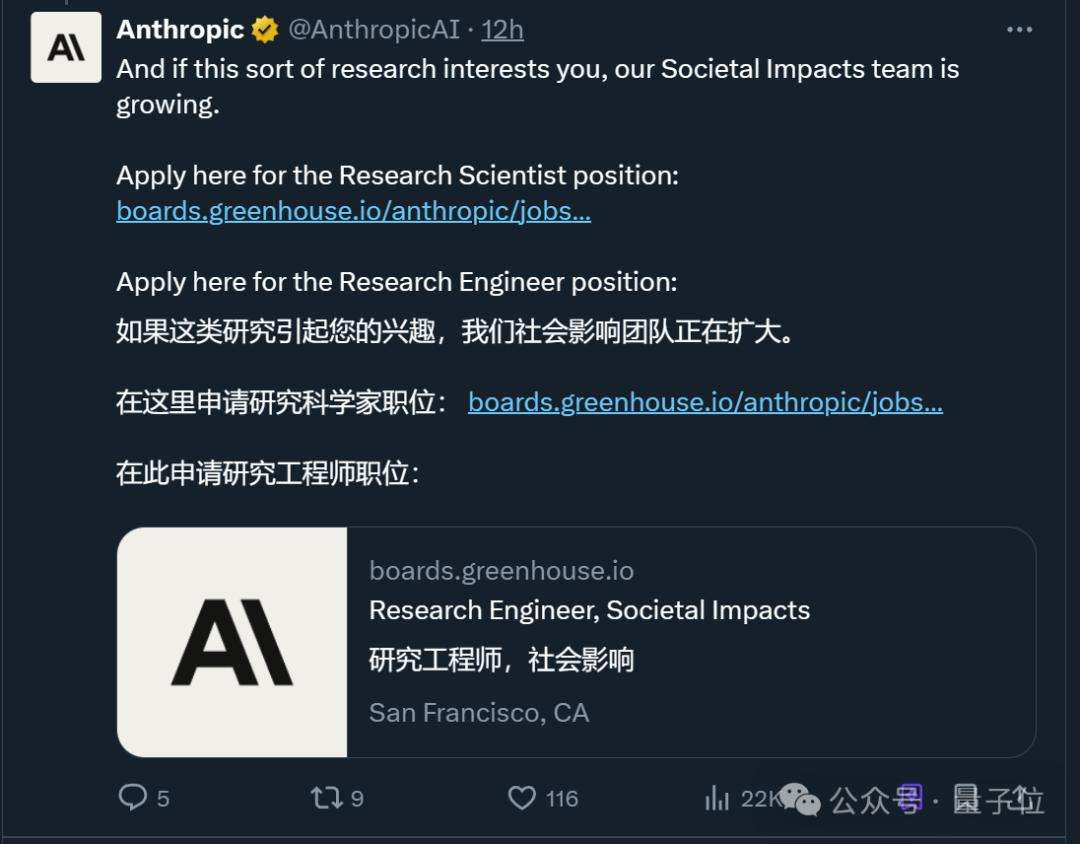 官方强调了分析存在的局限性,不过Anthropic将继续推进研究,不仅公开数据集,还开展招聘,为公司社会影响团队招研究科学家和研究工程师。