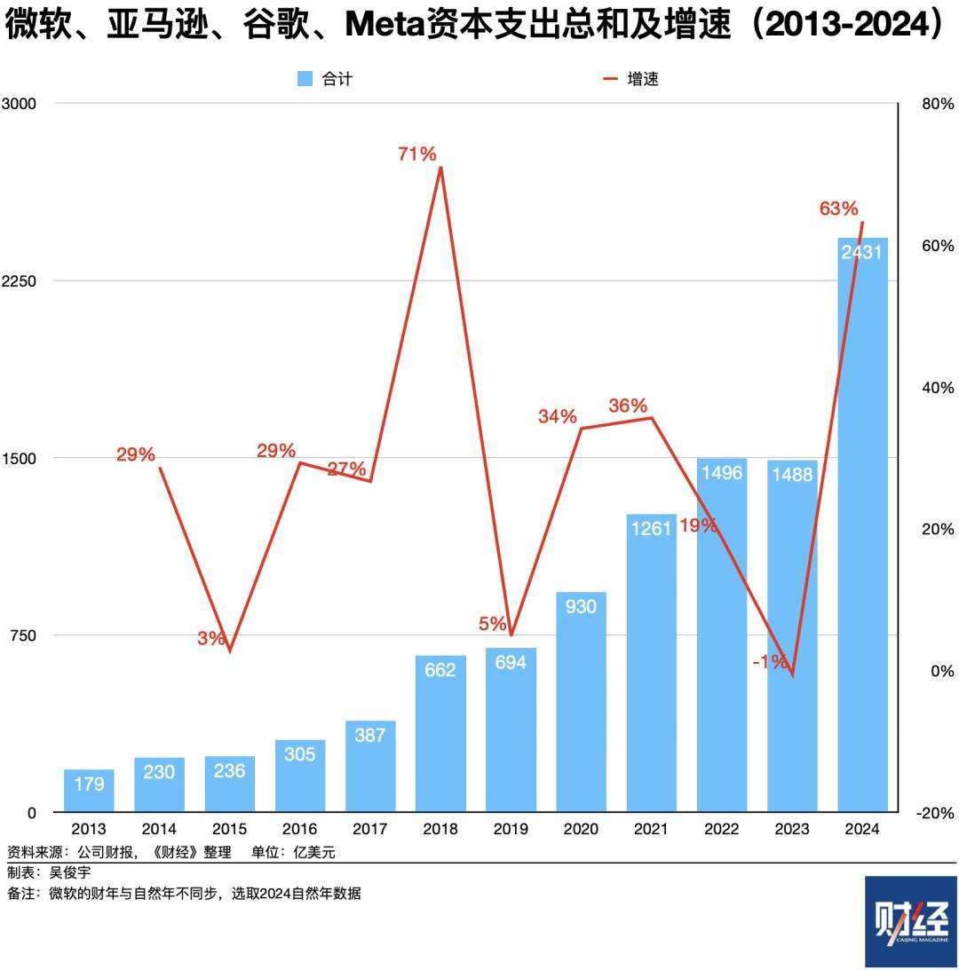 在此背景下,美国四家科技巨头微软、亚马逊、谷歌、Meta的态度引人关注。至少目前,它们仍坚持“大力出奇迹”,持续大规模投入算力。数据显示,2024年这四家公司资本支出均达历史最高点,2025年虽增速略有回落,但仍将高速增长。