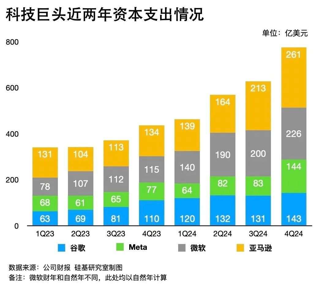 科技领域正经历一场变革,科技巨头在AI基建方面的资本支出备受关注。自2023年Q2起,微软、Meta、亚马逊和谷歌的资本支出呈上升态势,2024年,这四家科技巨头在资本开支上花费超2400亿美元,2025年预计将超3200亿美元。