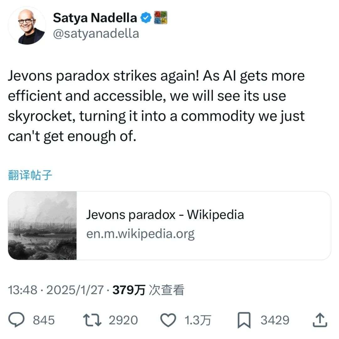 对于科技巨头在人工智能领域的支出,存在不同看法。质疑声认为AI军备竞赛可能是豪赌,DeepSeek证明低成本训练运行模型也能达相同效果;另一种声音则从中长期视角出发,认为新的算力投入对AI探索仍有必要,微软CEO重提「杰文斯悖论」。